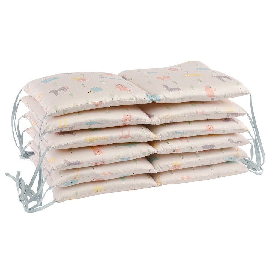 Бортик в кроватку из сатина с принтом Animalia world из коллекции Tiny world сделает первую кроватку малыша особенно уютной и безопасной: защитит от случайного сквозняка, немного приглушит внешние звуки и свет, прикроет жесткое ограждение кроватки. Принт нанесен на обе стороны бортика. Изделие подойдет для обычной и для круглой кроватки-трансформера, состоит из 6 секций по 2 «подушечки» и крепится к кроватке прочными завязками. Бортики будут сочетаться с любым постельным бельем.