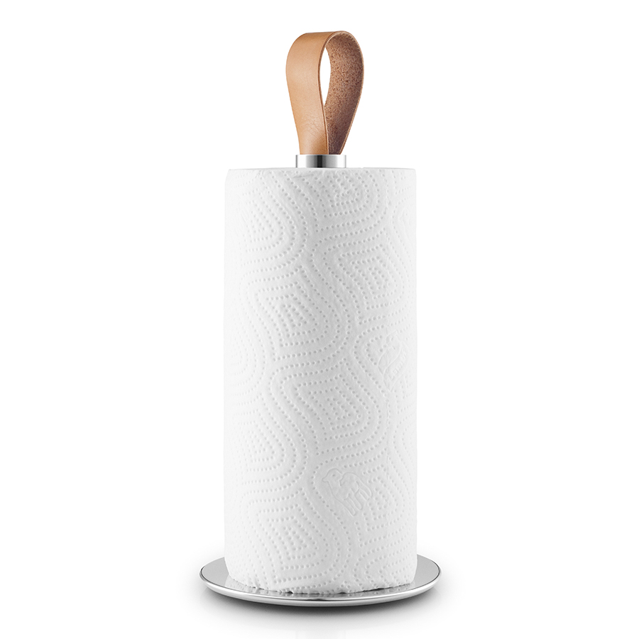 Изделие выполненоиз нержавеющей стали. Держатель оснащен петлей из натуральной кожи, за которую его удобно переносить. Утяжеленное прорезиненное основание остаётся устойчивым даже в процессе отрывания бумаги, а также не оставляет царапин на столе. Подходит для большинства форматов рулонов.