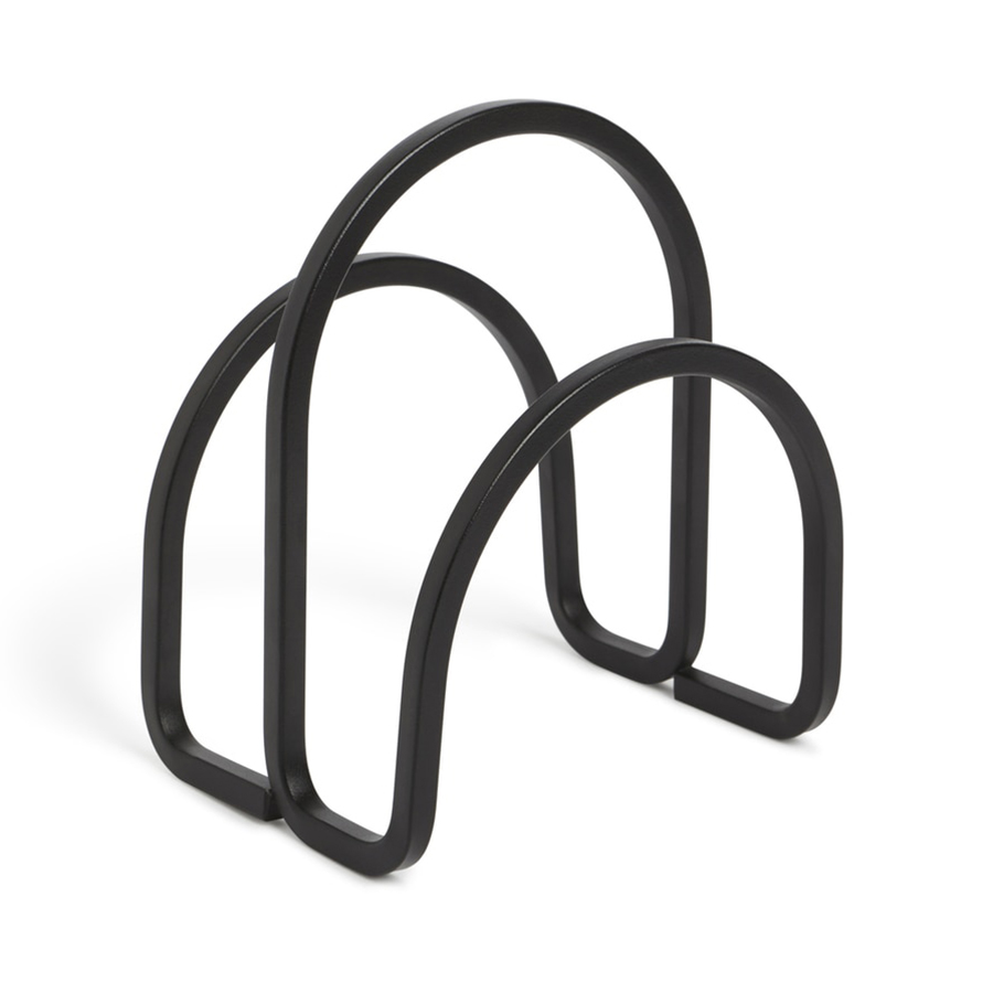 Аксессуар выполнен из металла, выгнутого в графическую линию. За счет компактных размеров держатель займет мало места на столе. Встроенный разделитель служит в качестве ручки для удобной переноски салфетницы.