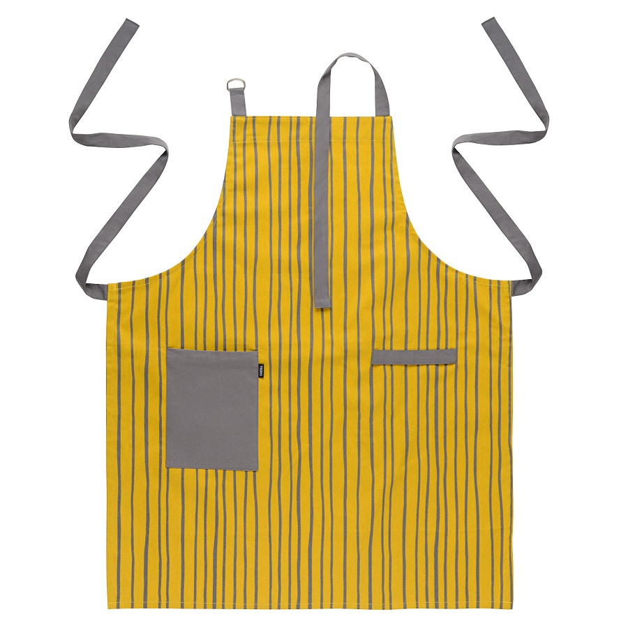 Фартук из хлопка горчичного цвета с принтом Полоски из коллекции Prairie защитит одежду во время готовки и работы на кухне. Модель с накладным карманом и клапаном для кухонного полотенца, бретель нагрудника регулируется по длине. Фартук с контрастными серыми полосками можно дополнить другим кухонным текстилем из этой же серии. Материал – экологически чистый хлопок. Тип плетения: твил. Плотность ткани - 215GSM.