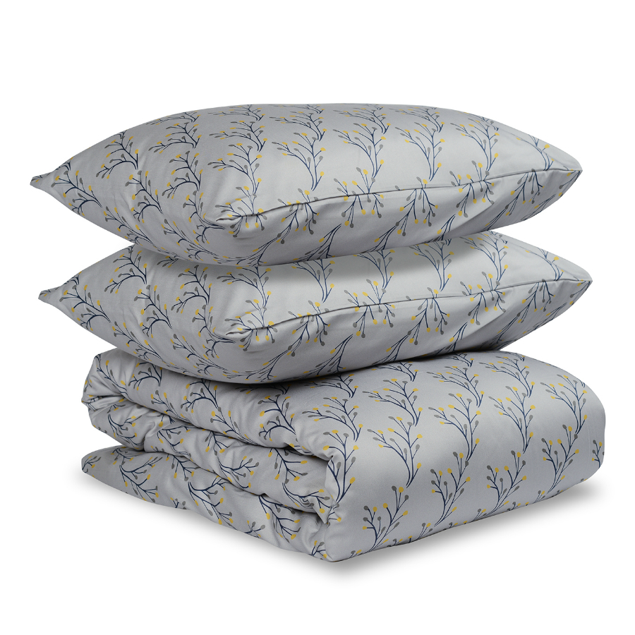 Комплект постельного белья из сатина с принтом ",Соцветие", из коллекции Russian North - прекрасный выбор для любителей природных мотивов, стилизованных в простой графике. Разбавив его наволочками и простыней темно-синего, светло-серого или горчичного цветов из коллекции Essential, вы получите готовое дизайнерское решение для вашей спальни. Хлопковый сатин плотностью 210 ТС приятен на ощупь и обладает естественным блеском. Он не теряет внешний вид даже после множества стирок, не деформируется и не линяет, на нем не образуются катышки.