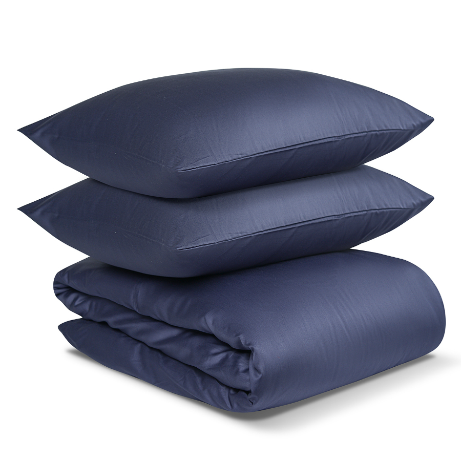 Пододеяльник и две наволочки 50х70 выполнены из плотного хлопкового сатина. Приятный на ощупь материал хорошо плотностью 210ТС пропускает воздух, обеспечивая коже комфорт в течение сна. Однотонный комплект представлен в насыщенном синем оттенке.