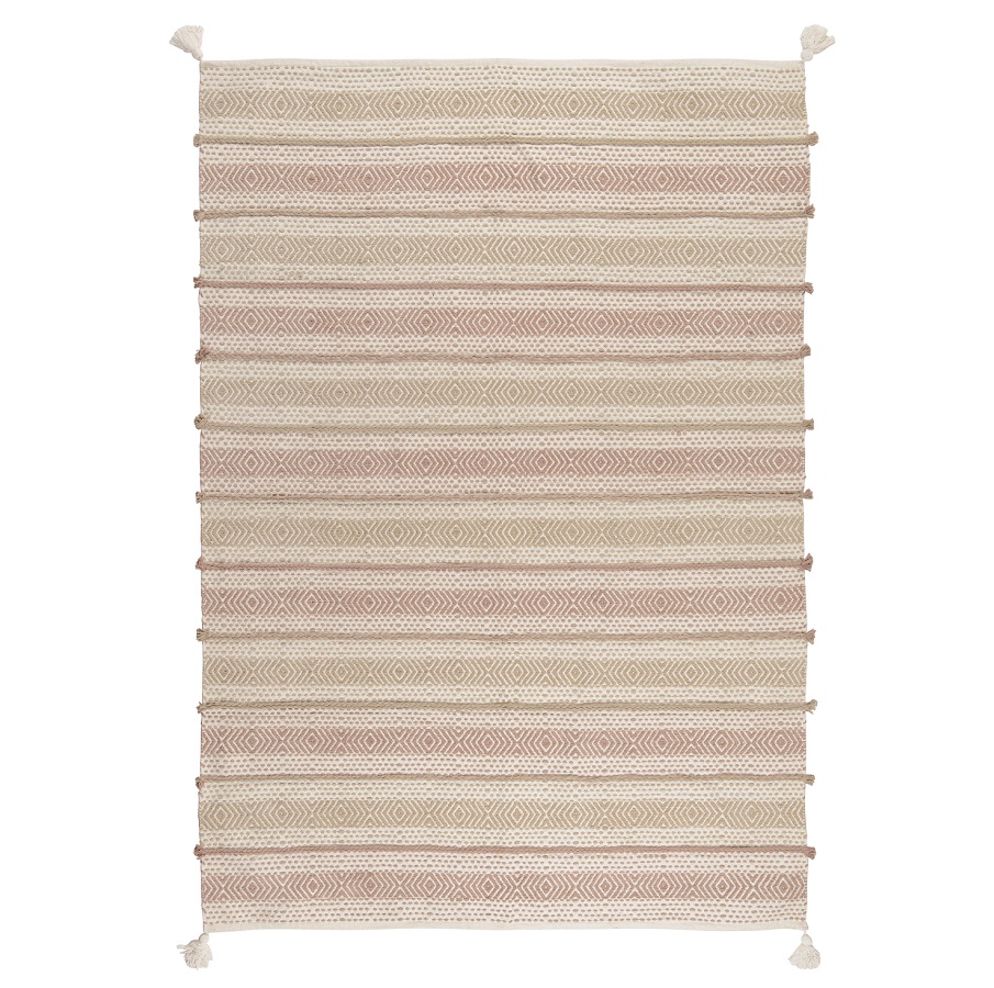 Ковер из хлопка Kerala из коллекции Ethnic украшен , ,линейным геометрическим принтом в бежевых тонах и пышными кисточками по углам. Он органично впишется в скандинавский стиль, минимализм или бохо. Изделие выполнено из прочного высококачественного хлопка. Ковер представлен в нескольких размерах.