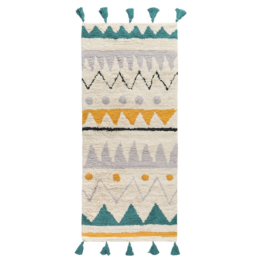 Ковер из хлопка с контрастным этническим орнаментом из коллекции Ethnic украшен кисточками. Он добавит уюта в гостиной, спальне или детской комнате, Особенно хорошо будет смотреться в интерьерах в скандинавском стиле или бохо. Ковер представлен в трех размерах.