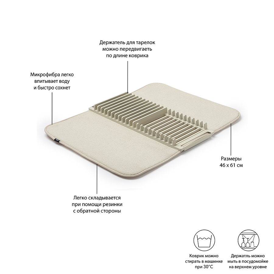 Коврик удобен для сушки чашек, стаканов и глубоких мисок, а подставка — для тарелок и блюдец. Легко разбирается для удобной чистки. Для хранения компактно складывается и закрепляется с помощью эластичных завязок. Размеры в разложенном виде: 61 x 45.8 x 2.5 см.