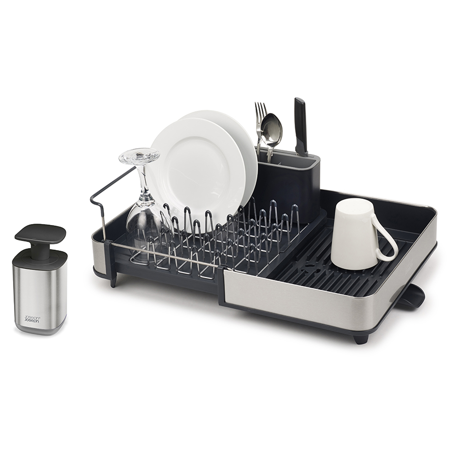 Сушилка легко раздвигается под большое количество посуды, при необходимости она может изменять размер почти вдвое. Металлические стойки с мягкими зубцами бережно удерживают тарелки, защищая их от царапин. Стальная решётка снимается для удобной очистки. Встроенная рейка поддерживает большие предметы, такие как разделочные доски или крышки. Съёмный контейнер для столовых приборов дополнен слотами для ножей. , ,Сушилка снабжена регулируемым сливным каналом, который направляет избыток воды прямо в раковину. Диспенсер для мыла имеет эргономичную изогнутую головку насоса для простого нажатия запястьем, когда ваши руки грязные. В пластиковом флаконе предусмотрено прозрачное окно для удобного контроля остатка мыла. Благодаря удобным ножкам оба аксессуара более устойчивы. Особенность моделей – стильная отделка из нержавеющей стали.