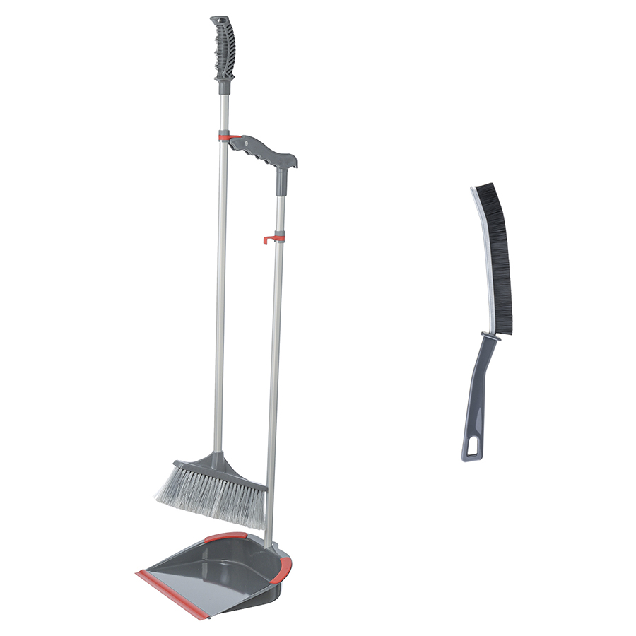 Ручки инвентаря выполнены из прочного алюминия. Длинные щетинки щетки соединены внахлест, что обеспечивает качественное подметание. Совок дополнен специальной резиновой кромкой, которая плотно прилегает к полу, позволяя легко собрать всю пыль, грязь или мусор. Инвентарь удобно соединяется между собой для компактного хранения. Узкая щетка позволяет чистить кухонную и ванную сантехнику, толстые щетинки проникают в любые швы и щели. Щетина не линяет и легко моется.