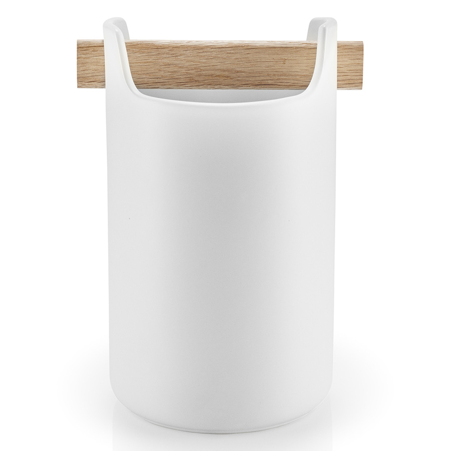 Органайзер Eva Solo выполнен из белоснежной керамики с ручкой из натурального дуба, которая также выполняет функцию разделителя, создающего внутри две секции для хранения.