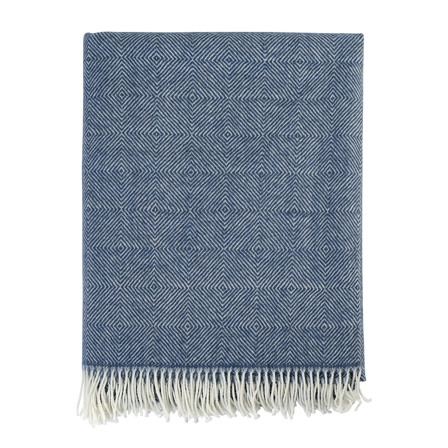 Синий плед с белоснежной бахромой по краям украсили фактурным микроузором. Приятный на ощупь аксессуар выполнен из тонкой и при этом теплой шерсти мериноса. Такой материал мягче натурального шелка и в несколько раз эластичнее хлопка. Изделие упаковано в крафтовую коробку.