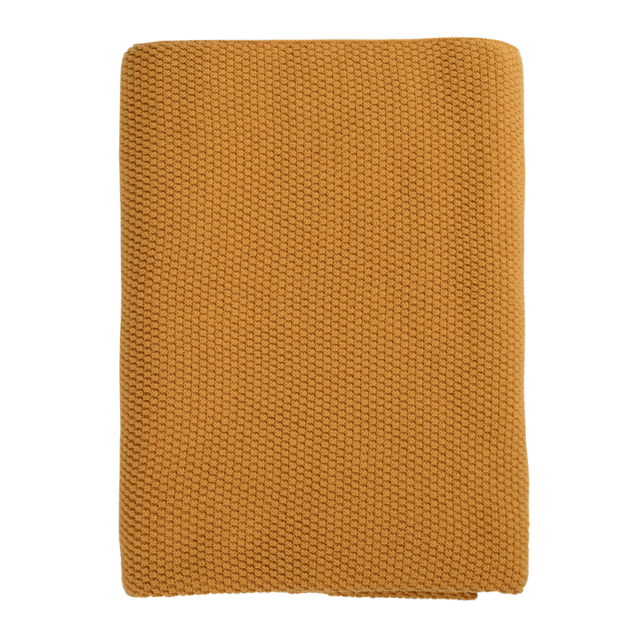 Вязаный однотонный плед оттенка шафран выполнен из натурального хлопка. Приятный на ощупь материал хорошо пропускает воздух, не электризуется и не вызывает аллергию. Изделие упаковано в брендированную крафтовую коробку.