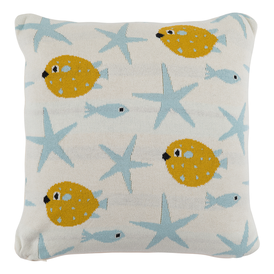Подушка декоративная с принтом Oceania world из коллекции Tiny world украсит детскую комнату. Подушка хорошо сочетается с пледом из этой же коллекции. Стилизованные изображения морских обитателей могут стать темой увлекательных разговоров даже с маленькими детьми.
