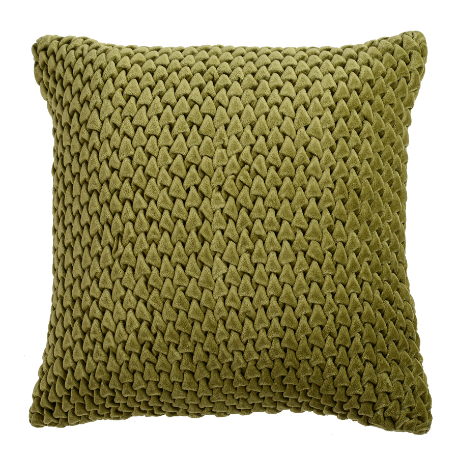 Декоративная подушка с фактурным стеганым узором выполнена из прочного хлопкового бархата. Нежный, приятный на ощупь материал не электризуется, не вызывает аллергию, и за ним легко ухаживать. За счет плотного наполнителя изделие оливкового оттенка хорошо держит форму.