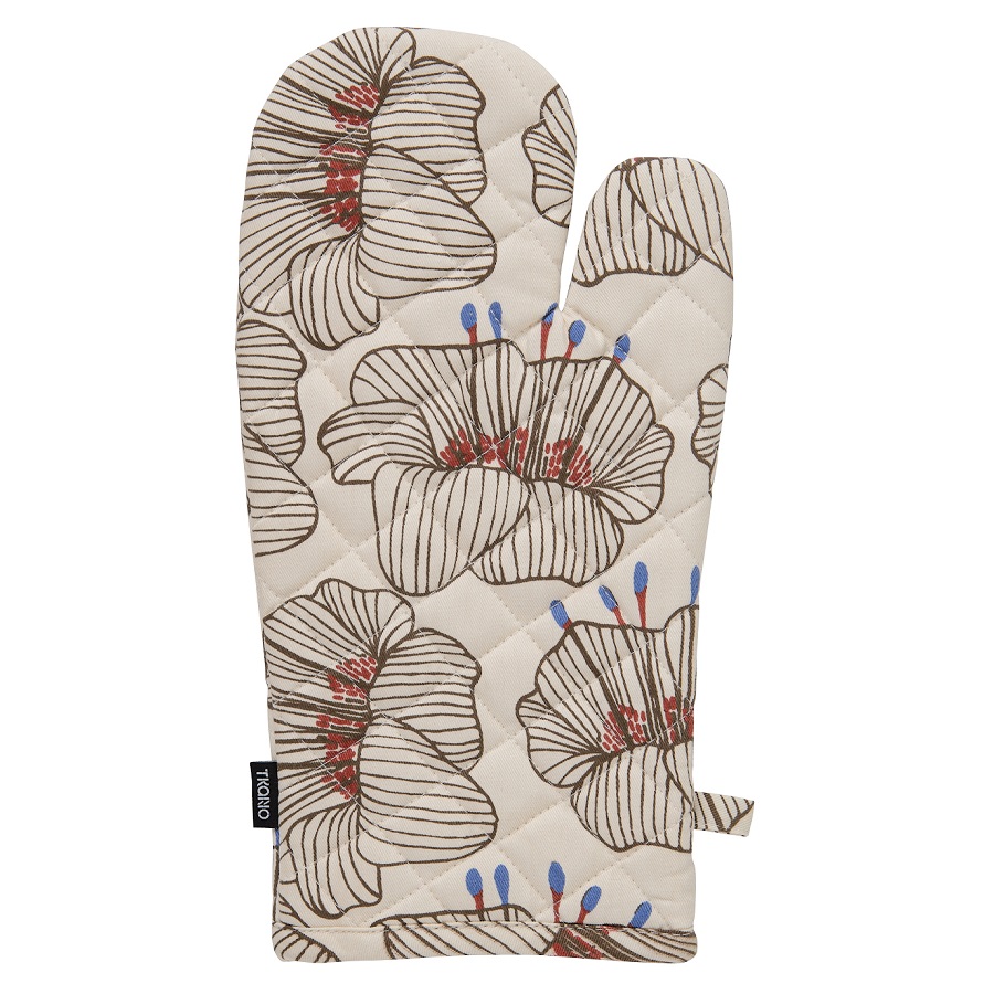 Прихватка-варежка из хлопка молочного цвета с принтом Цветы из коллекции Prairie – универсальный кухонный аксессуар. Дизайн изделия с крупными цветами станет , ,ярким акцентом и гармонично впишется в любой современный стиль. Не нагревается даже при длительном контакте с горячими поверхностями. Внешняя и внутренняя части выполнены из 100%, гипоаллергенного хлопка. Наполнитель: полиэстер. Есть удобная петелька для подвешивания. Плотность ткани - 215GSM.