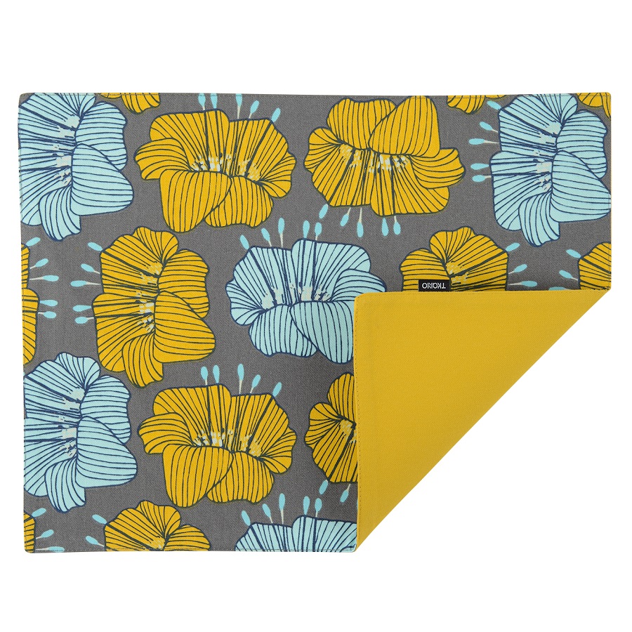 Двухсторонняя салфетка под приборы серого цвета с принтом Цветы из коллекции Prairie станет украшением праздничного и повседневного стола. Одна сторона украшена крупными цветами, а другая однотонная —горчичного оттенка.