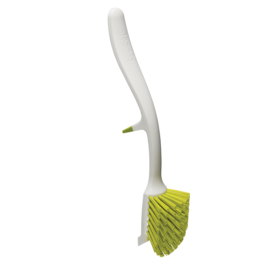 За нескользящие крючки , ,щетку можно подвешивать на внутренний край раковины: это не только экономит место, но и позволяет каплям воды аккуратно стекать прямо в слив. Щетка покрыта мягкой, не оставляющей царапин щетиной, изгибы которой позволяют тщательно очищать уголки подносов и блюд. Для крепко налипших остатков пищи предусмотрен специальный скребок. Материал не содержит бисфенола-А.