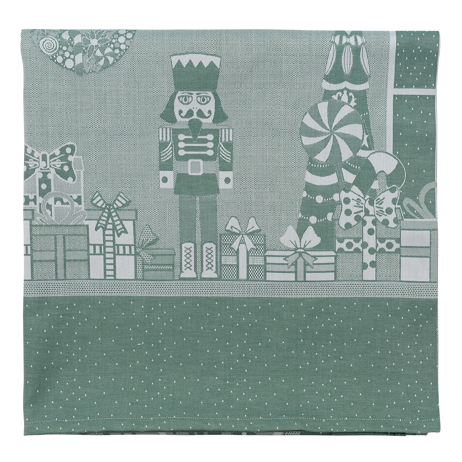 Дорожка на стол из хлопка зеленого цвета с жаккардовым , ,рисунком Щелкунчик из коллекции New Year Essential украсит праздничный новогодний стол и внесет разнообразие в повседневную зимнюю сервировку. Новогодняя сказка, любимая всеми с детства, стилизованная в оригинальном дизайне скатерти, органично впишется в любой современный интерьер. Модель выполнена из плотного хлопка - прочного материала, который хорошо впитывает влагу и не деформируется после множества стирок.