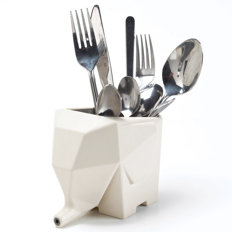 Есть такое выражение ",слон в посудной лавке", и ничего хорошего оно не подразумевает, но мы решили изменить ситуацию. По крайней мере, ручаемся, что со столовыми приборами наш слоник обращается бережно. Сложите внутрь после мытья вилки, ложки и ножи и поставьте сушилку так, чтобы её ",нос", , ,был над раковиной. Вода, стекая с приборов, будет уходит через хобот слона.Чисто, гигиенично и симпатично!